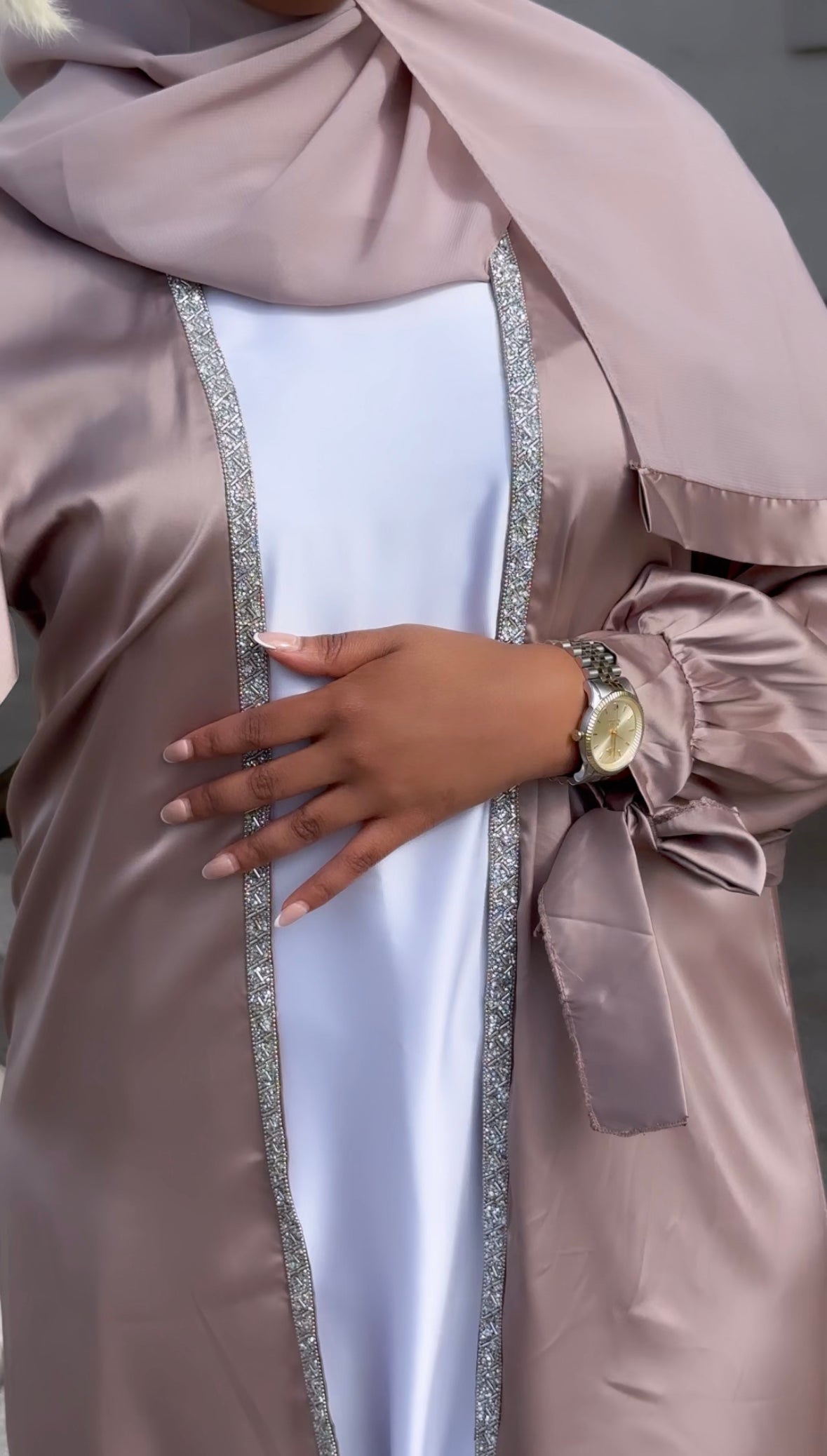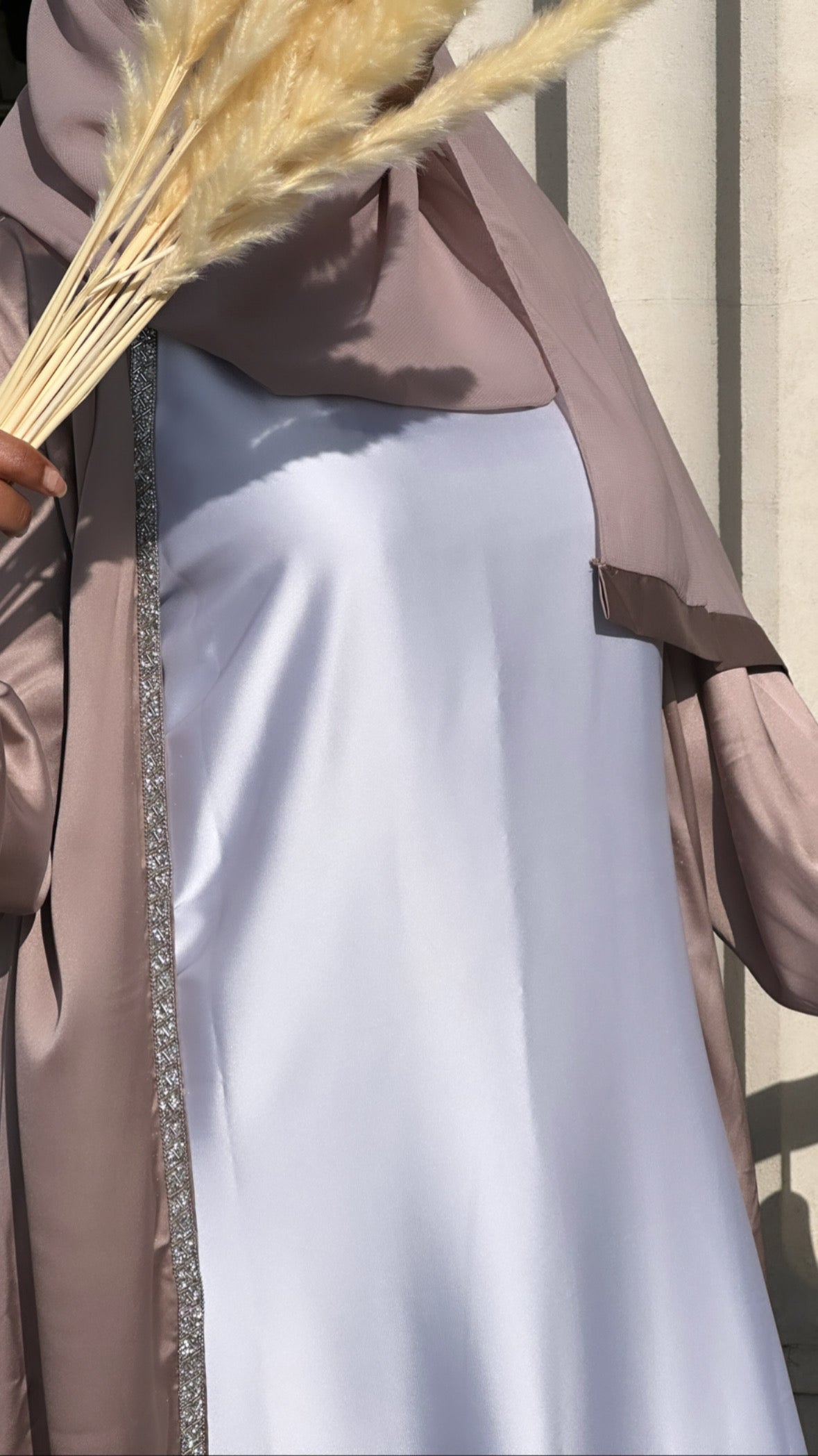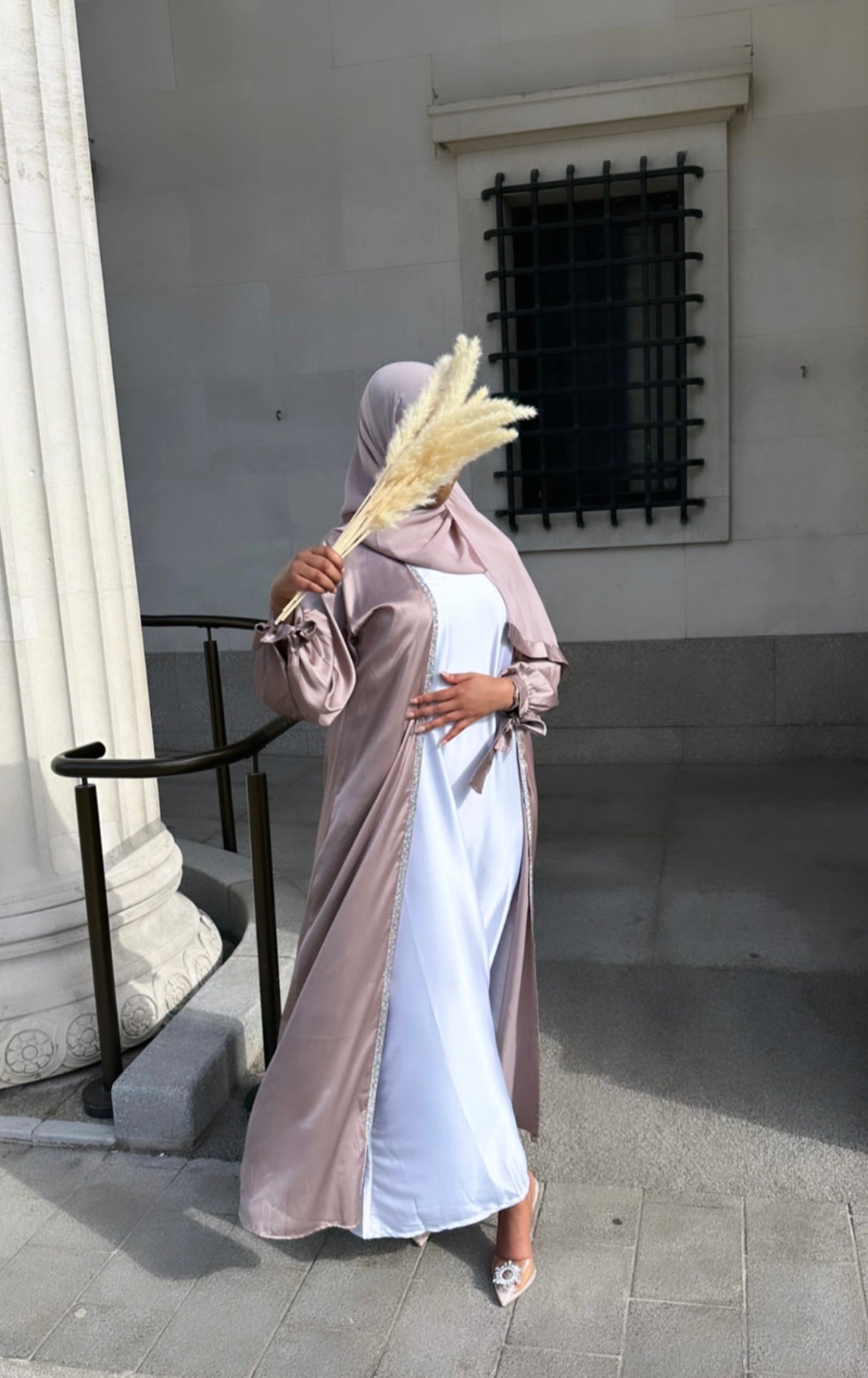 Our caramel satin abaya is designed with a stunning sequin detailing along the abaya, it is a 4 piece set that comes with a white satin slip dress, a matching chiffon hijab and a belt.