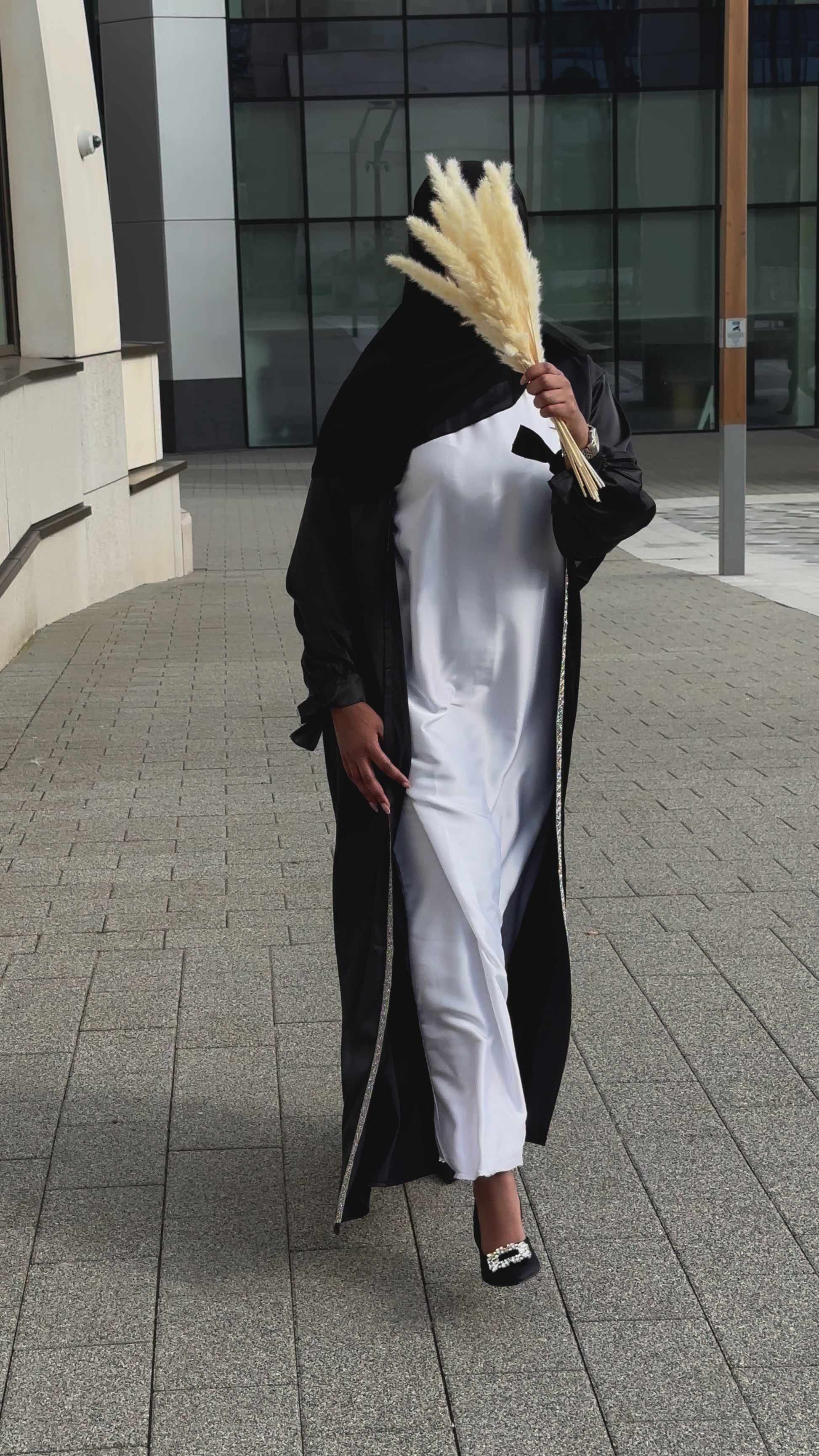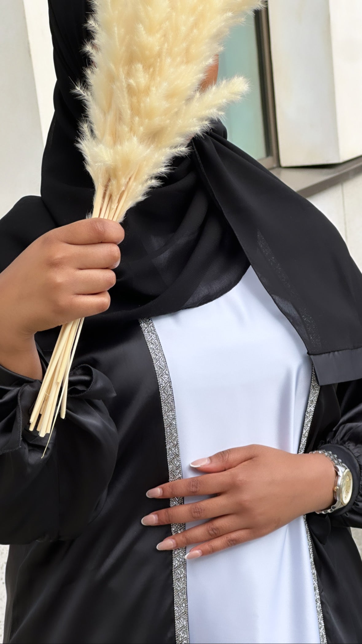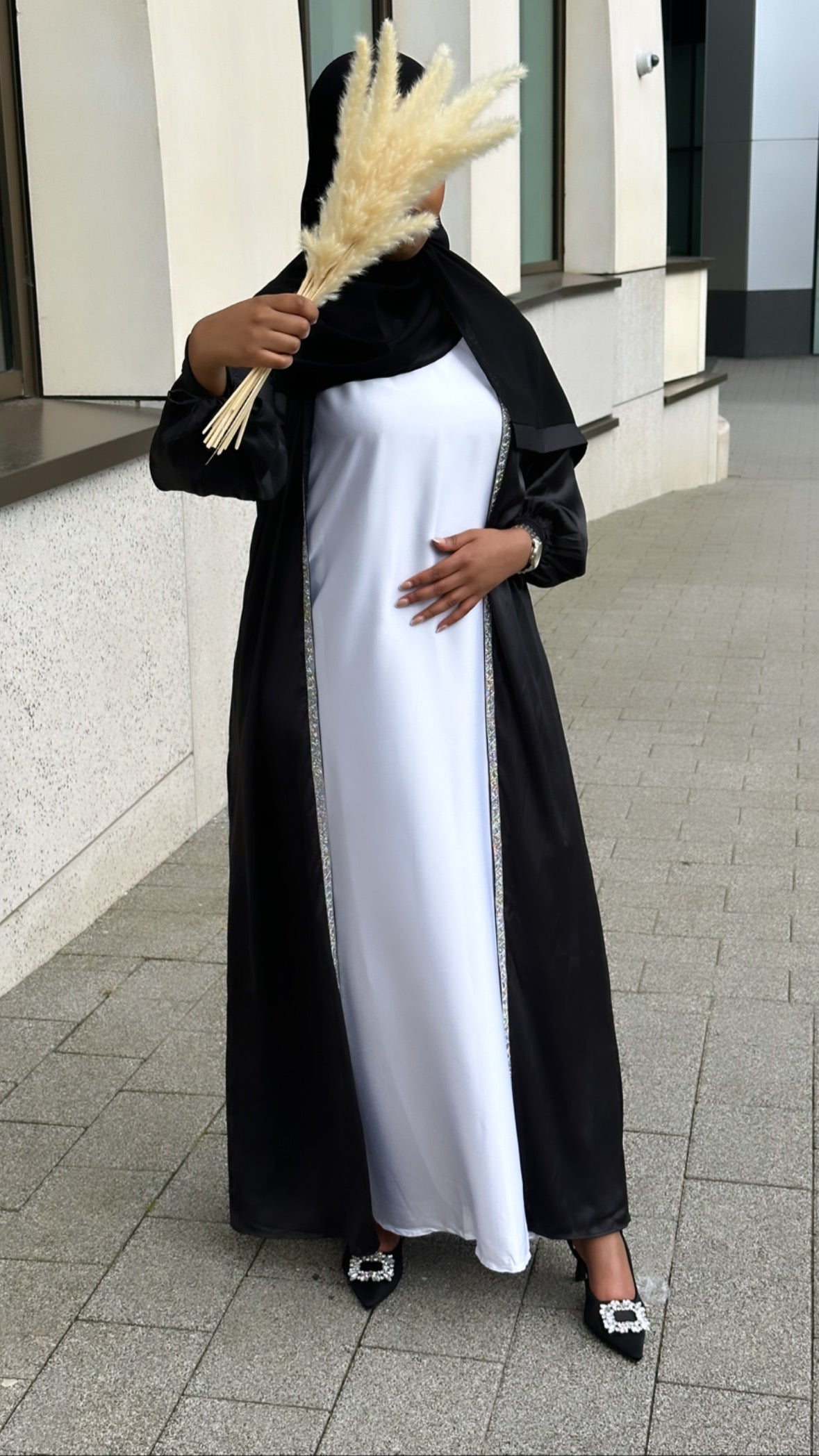 Our black satin abaya is designed with a stunning sequin detailing along the abaya, it is a 4 piece set that comes with a white slip dress, a matching chiffon hijab and a belt.