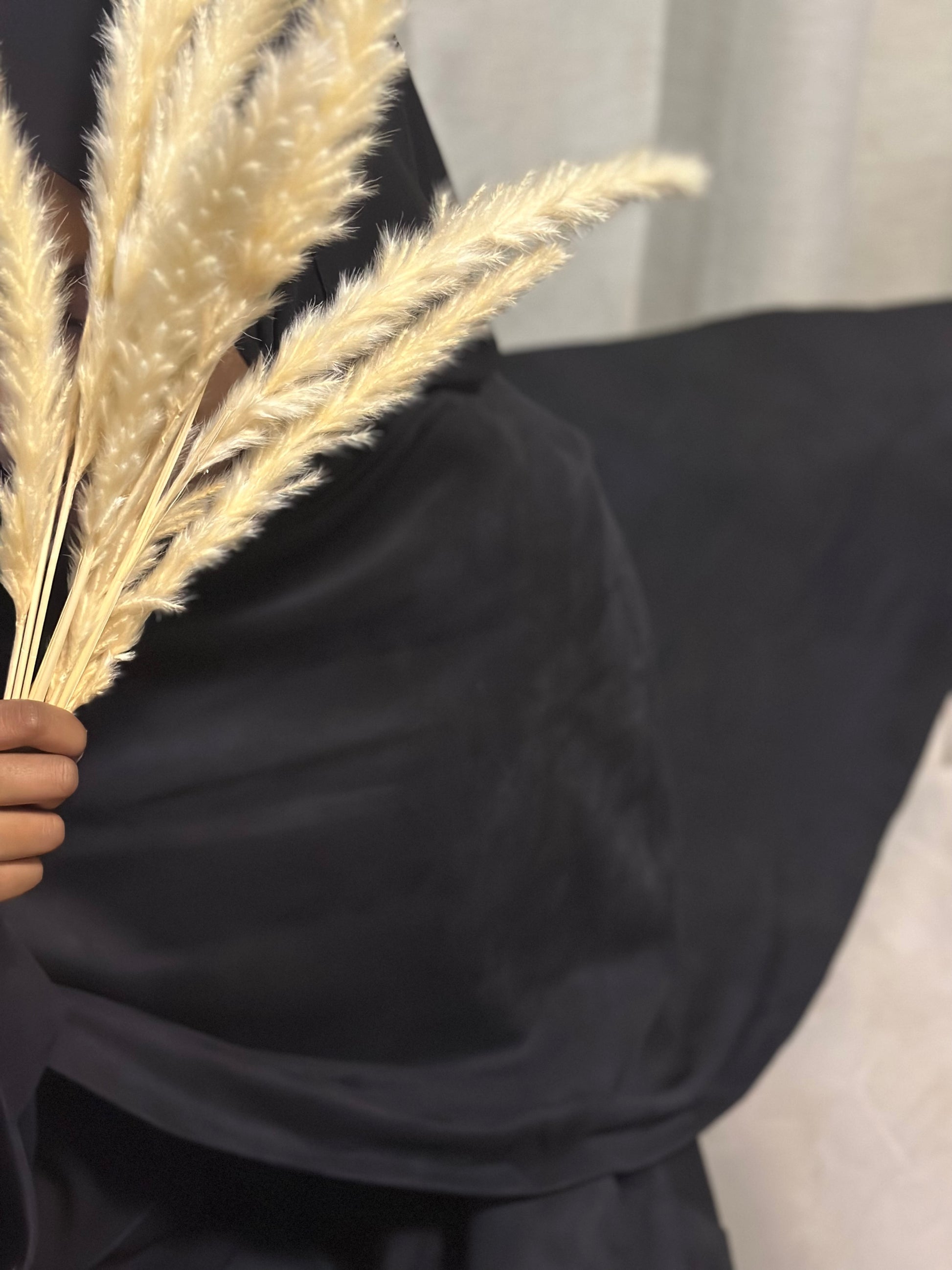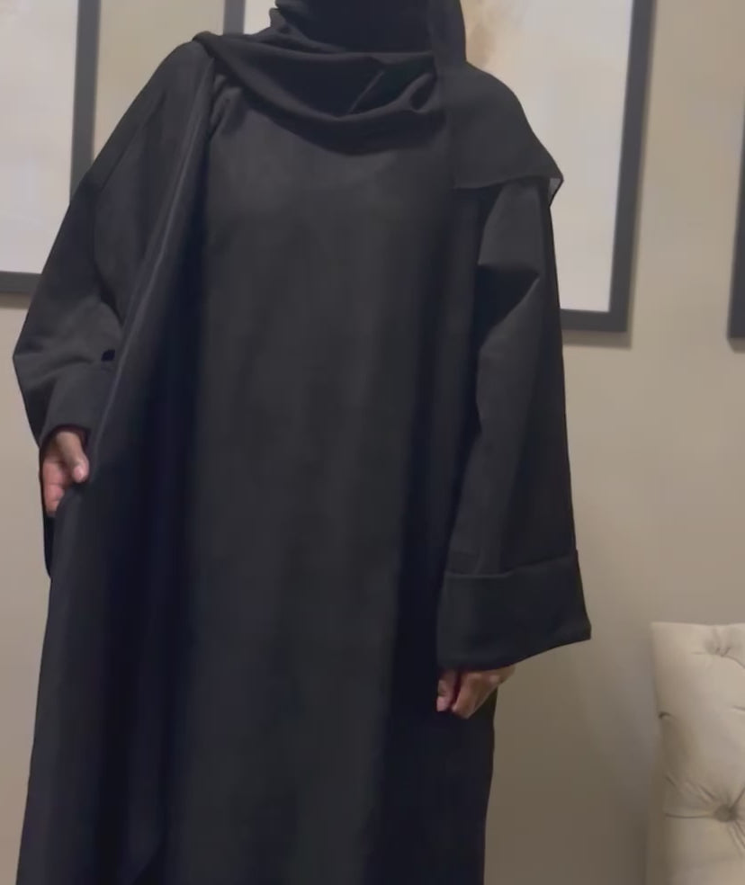 Introducing our stunning black suede cloak abaya, the perfect choice for autumn and winter! Crafted from luxurious suede, it promises to keep you warm and cozy during those chilly days. With two functional pockets for added practicality and a convenient button to secure your cape on your shoulder, this abaya combines style with functionality. Complete with a matching black chiffon hijab and belt, you can effortlessly enjoy warmth and modesty while staying chic and comfortable all season long!