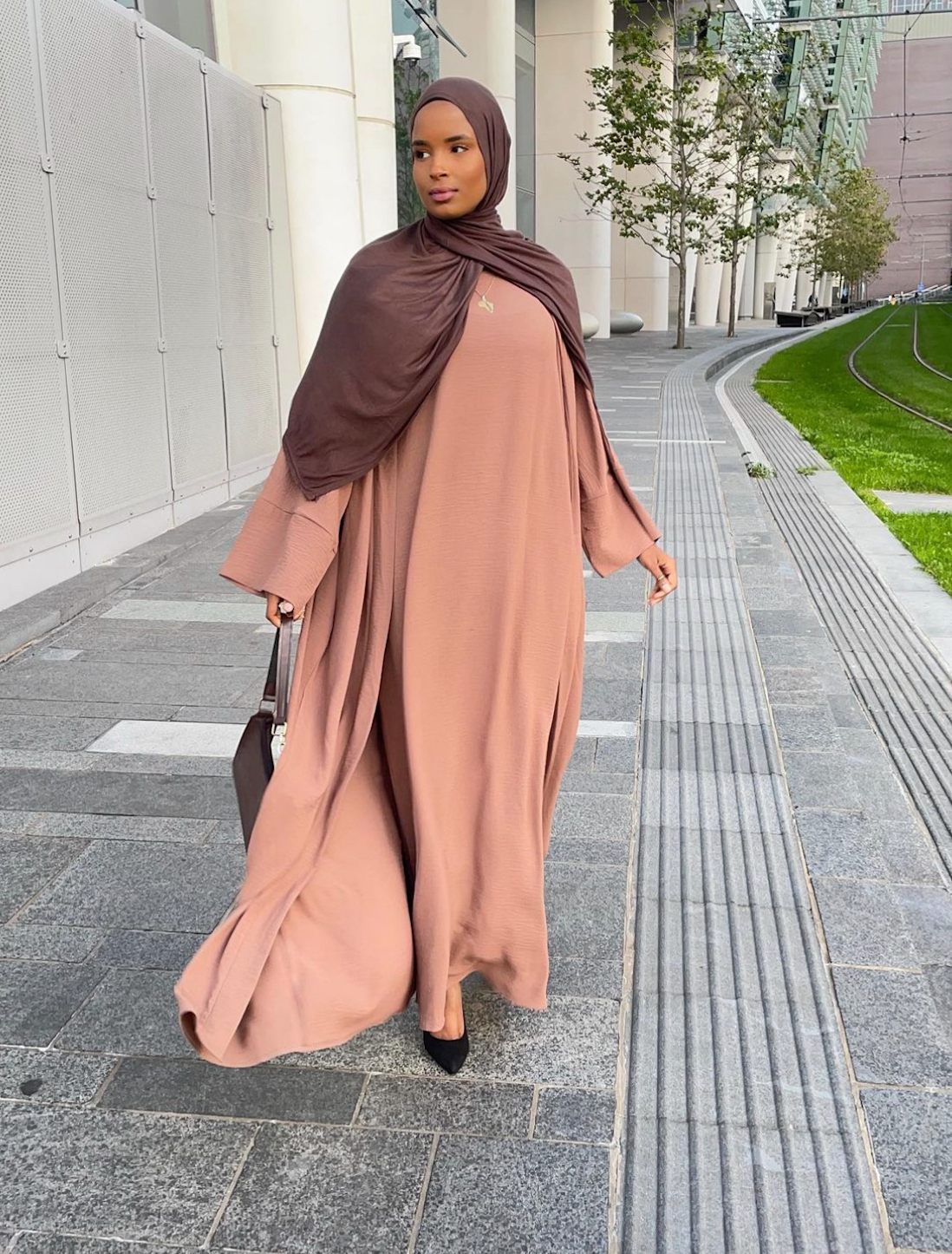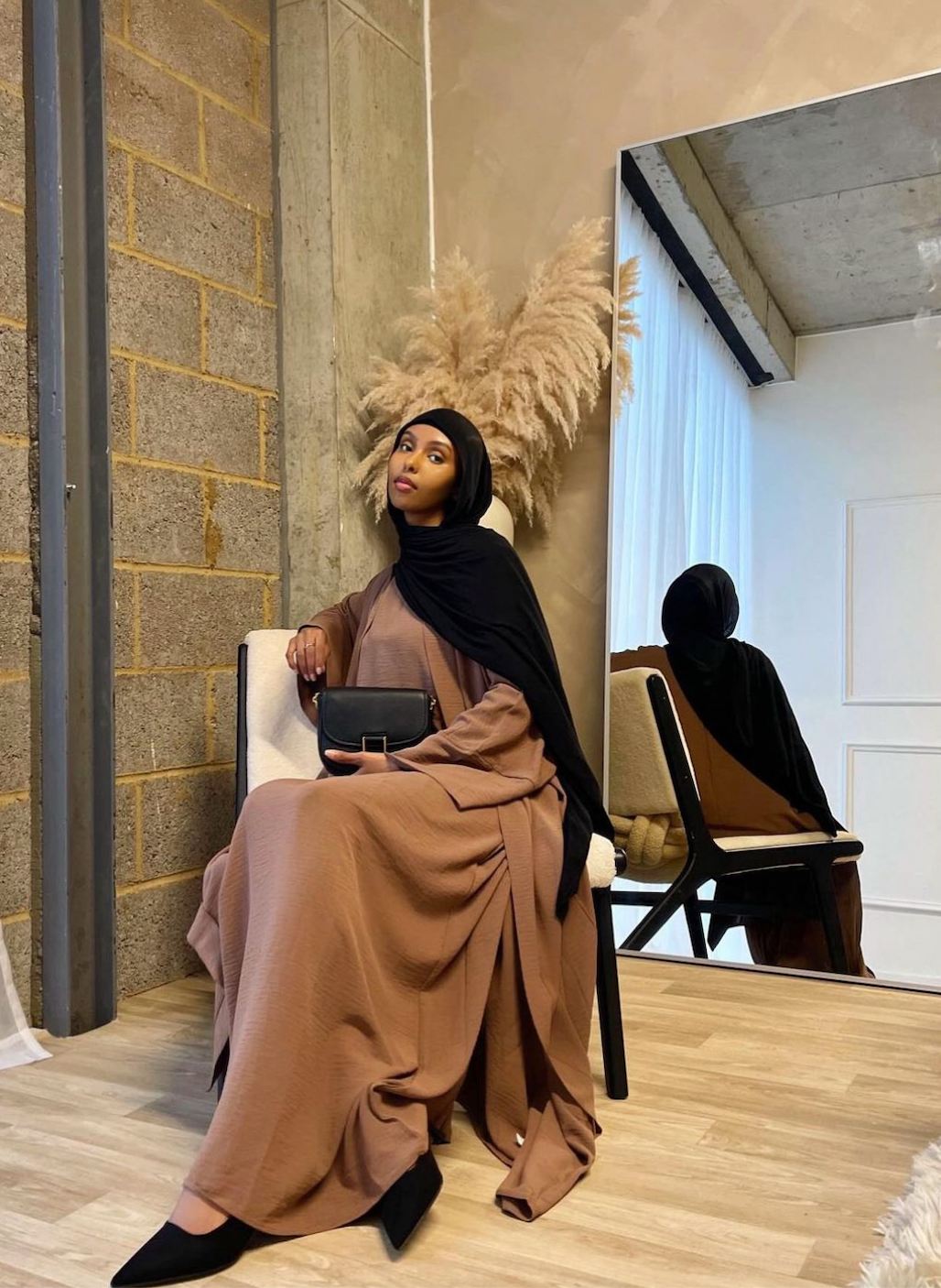 our gorgeous 3 piece nuura abaya in brown comes with a matching slip dress and a belt.