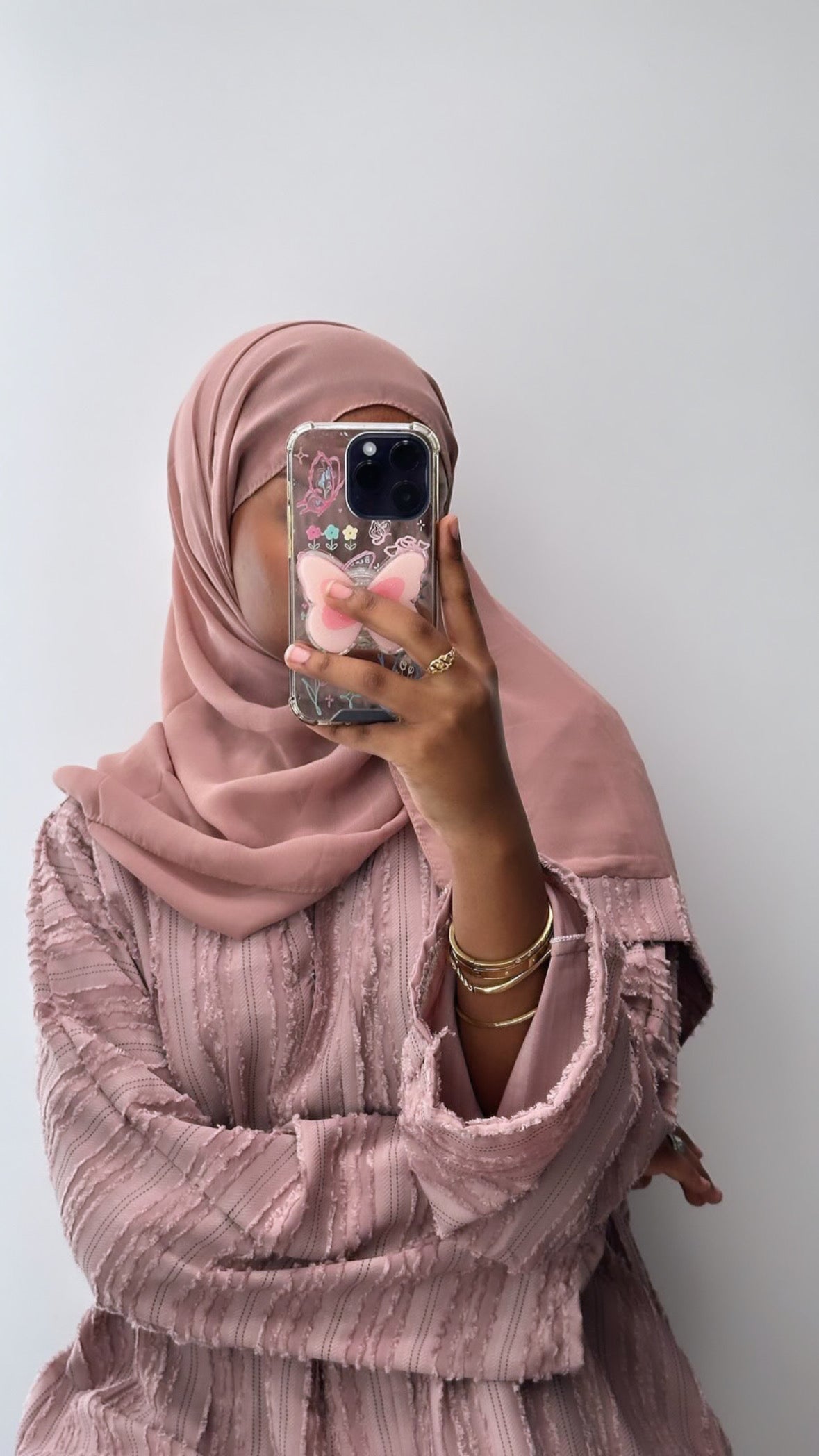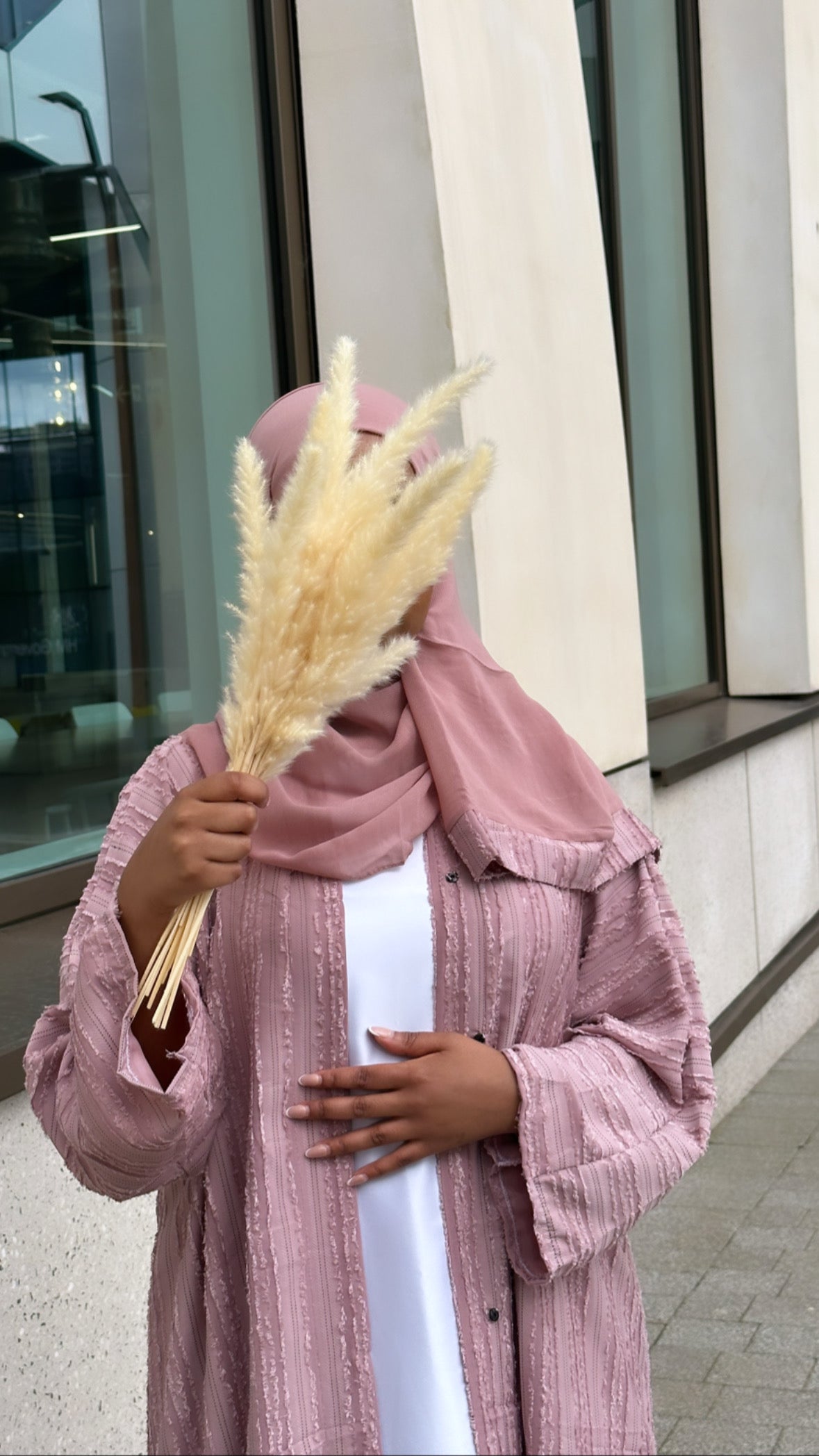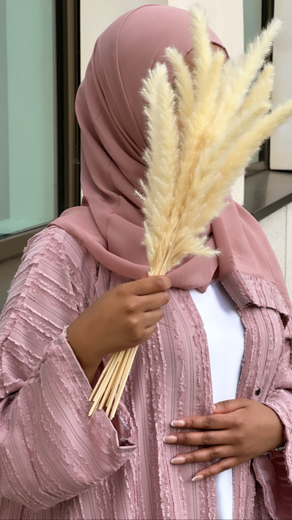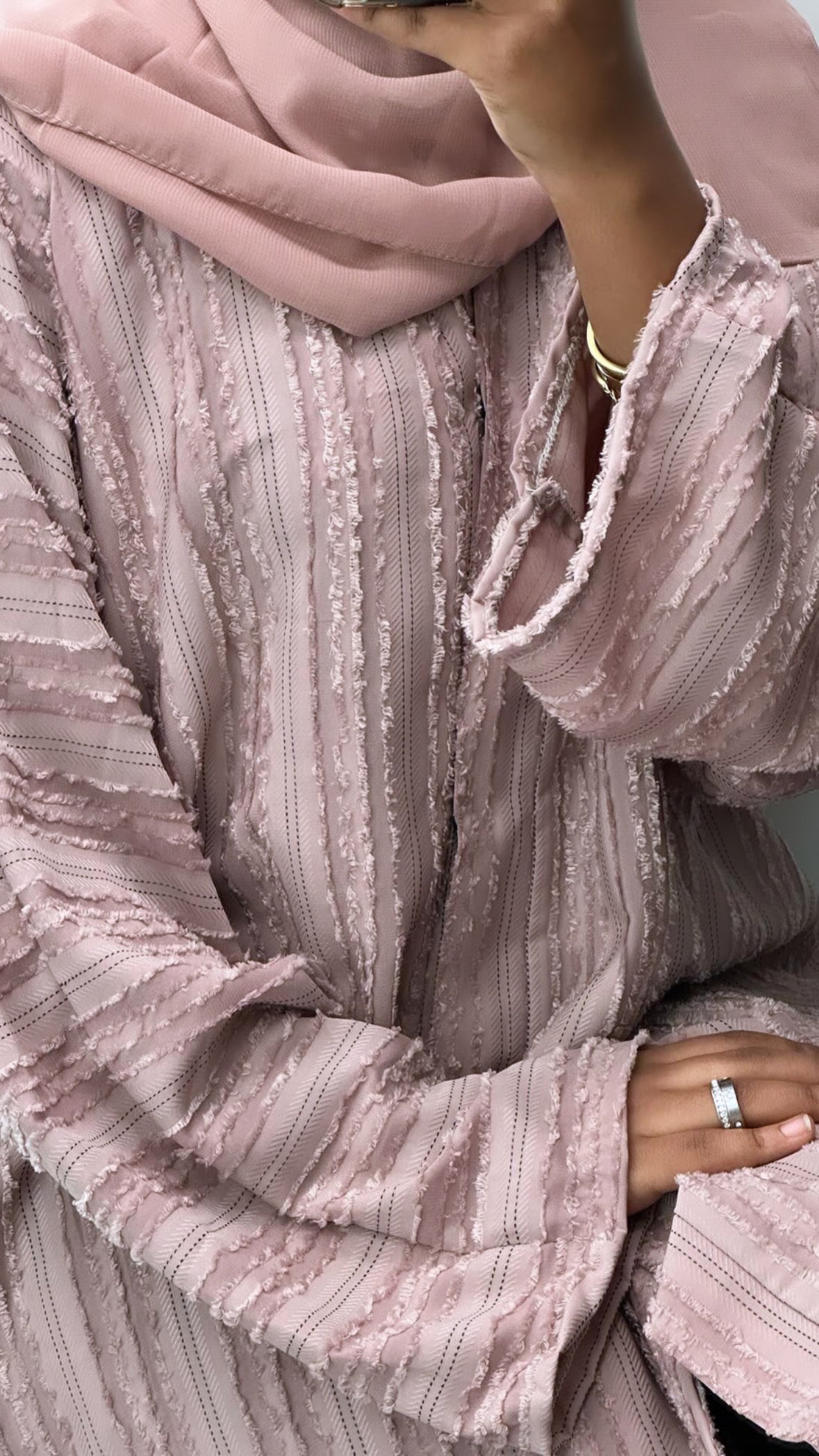 Our coral coloured stripe abaya comes with a matching chiffon hijab.