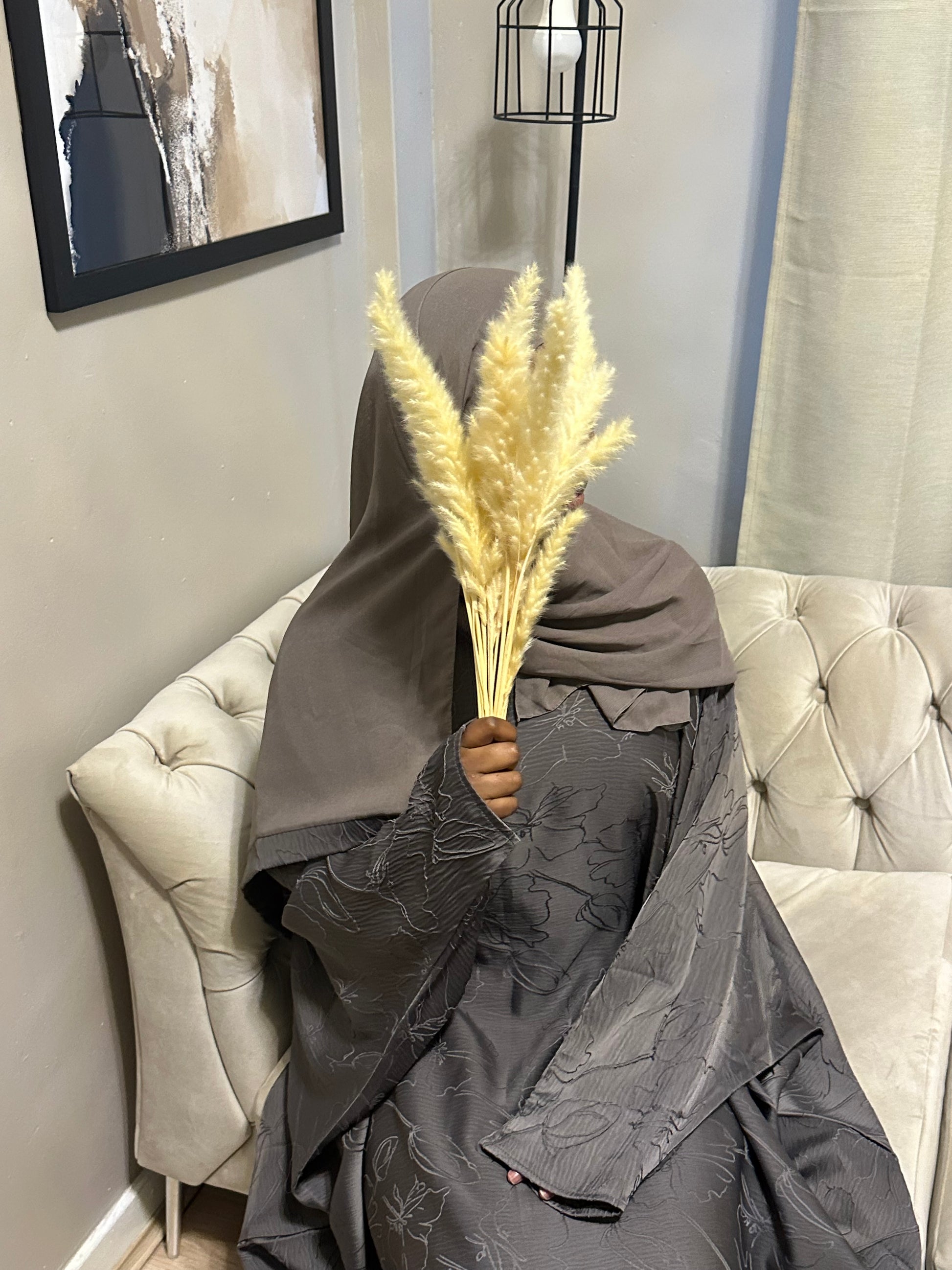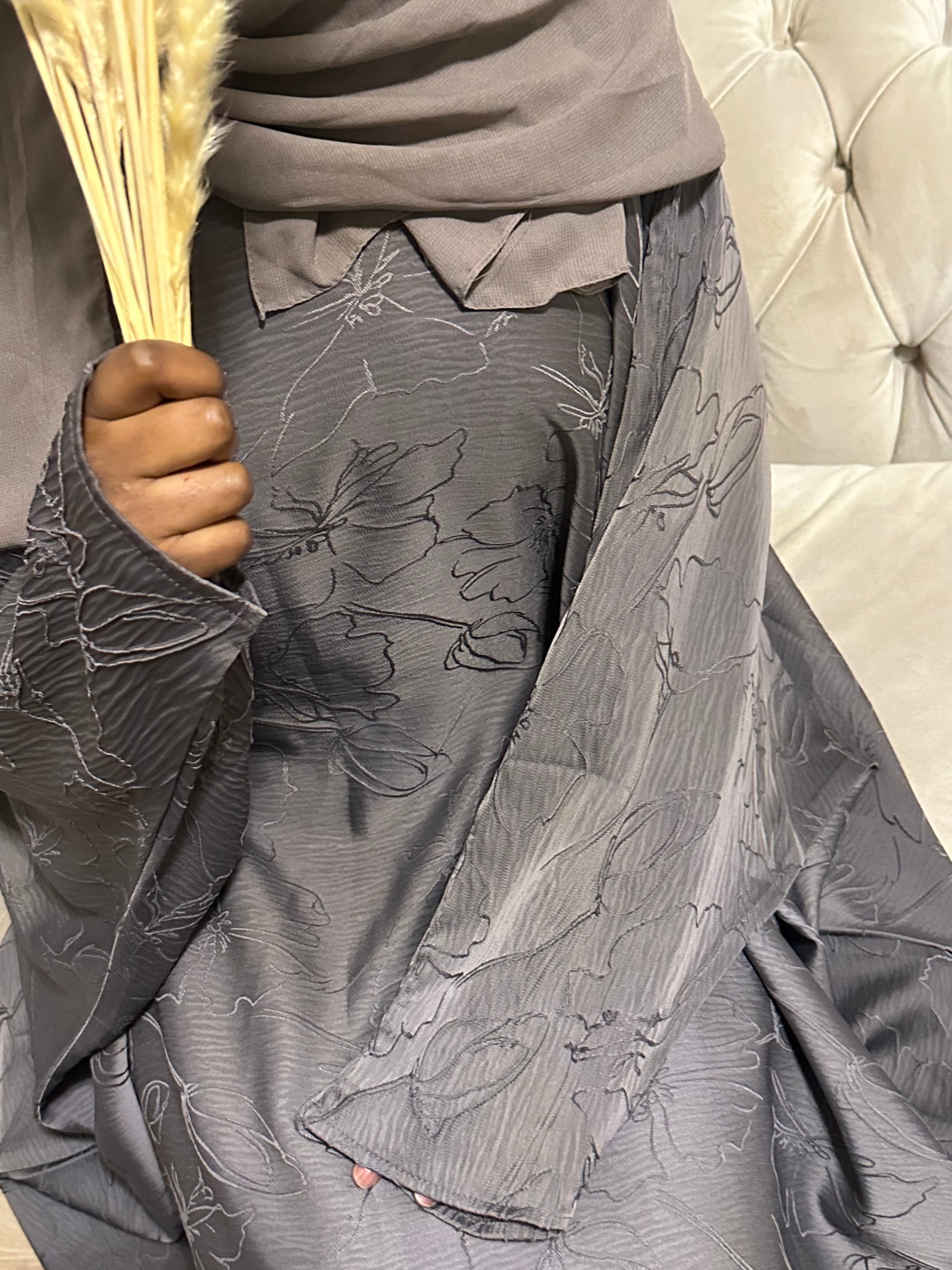 our closed grey jacquard butterfly abaya is very stylish and can be part of your everyday wear, the abaya is imprinted with a beautiful floral design. The abaya is a 2 piece set and comes with matching grey jacquard hijab same as the abaya (inner belt included)