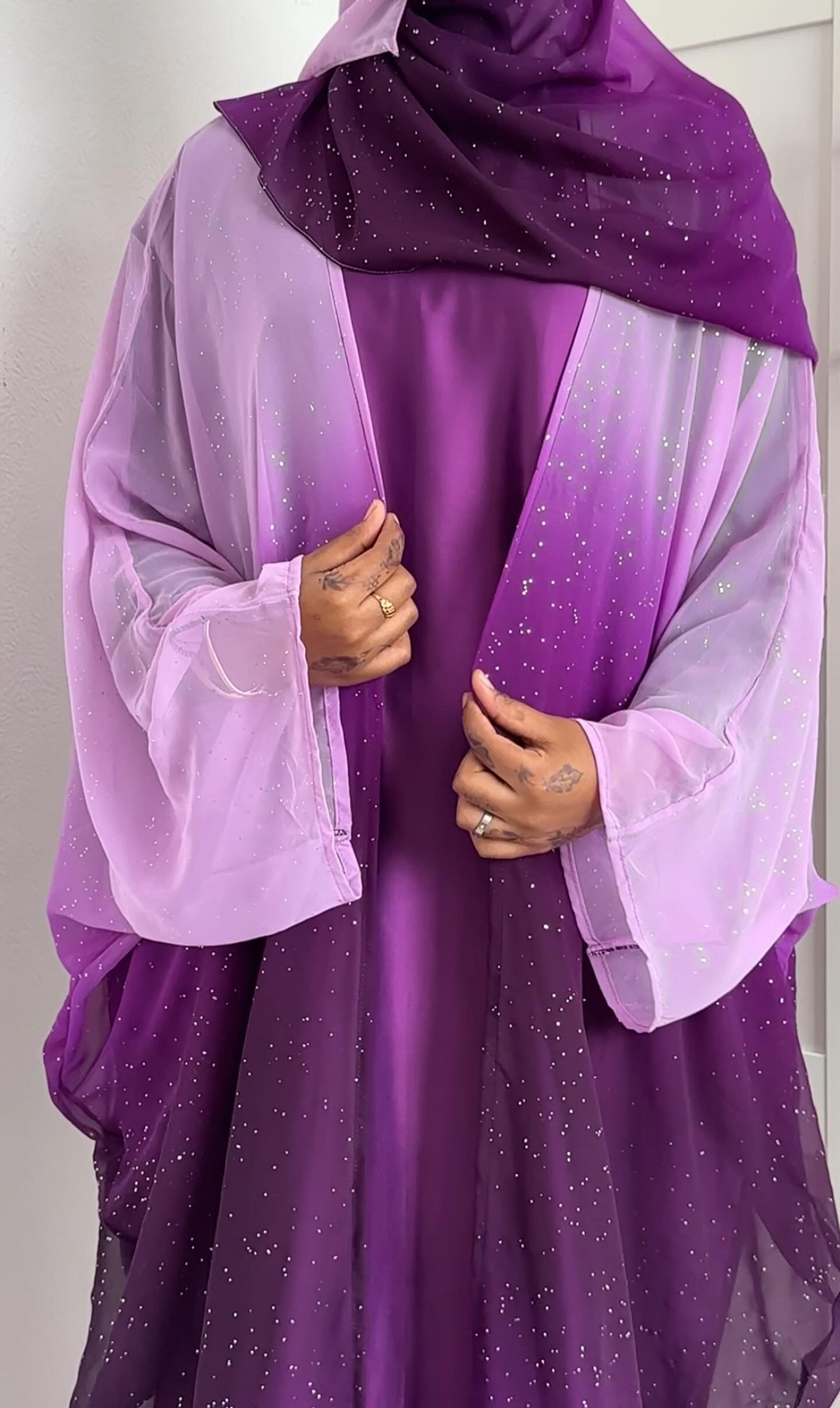 The lilac abaya is a 3 piece set that comes with a matching satin short sleeve slip dress and a matching lilac ombre hijab