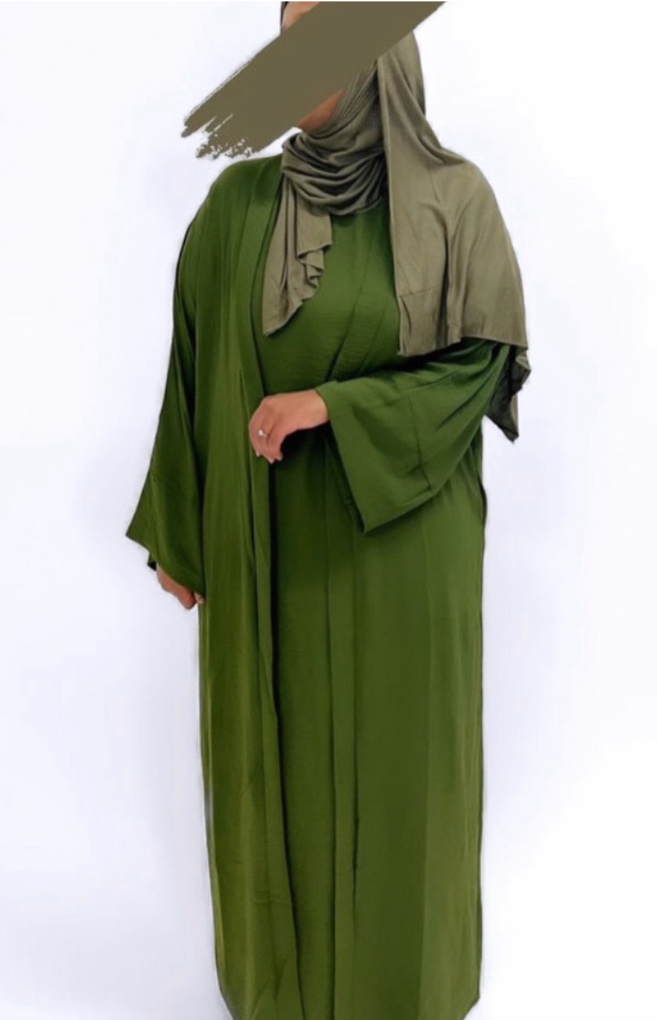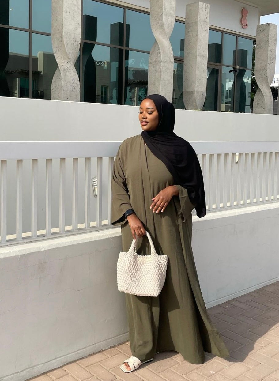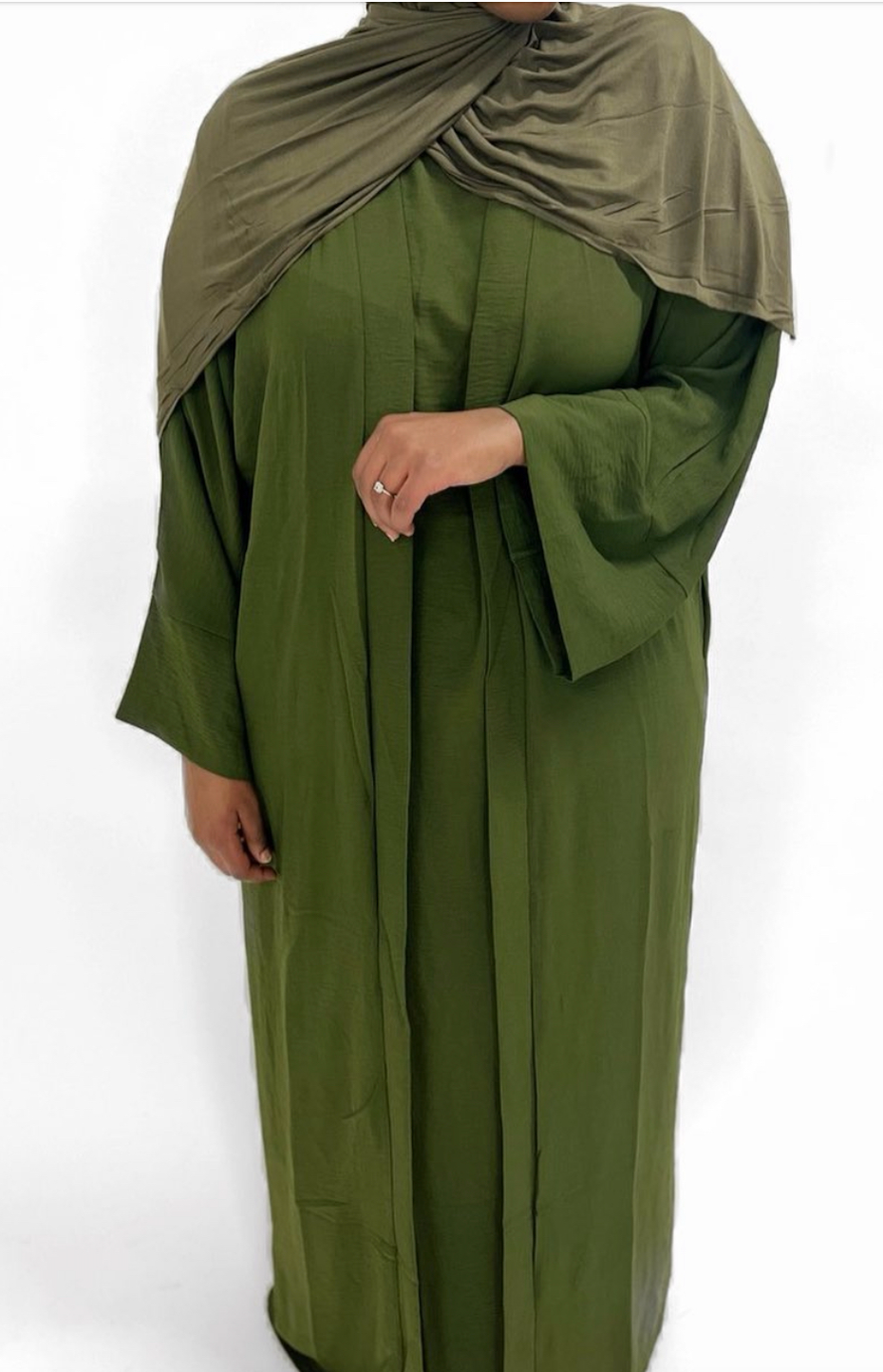 Our 4 piece nuura abaya in olive comes with a matching slip dress, matching hijab and belt.