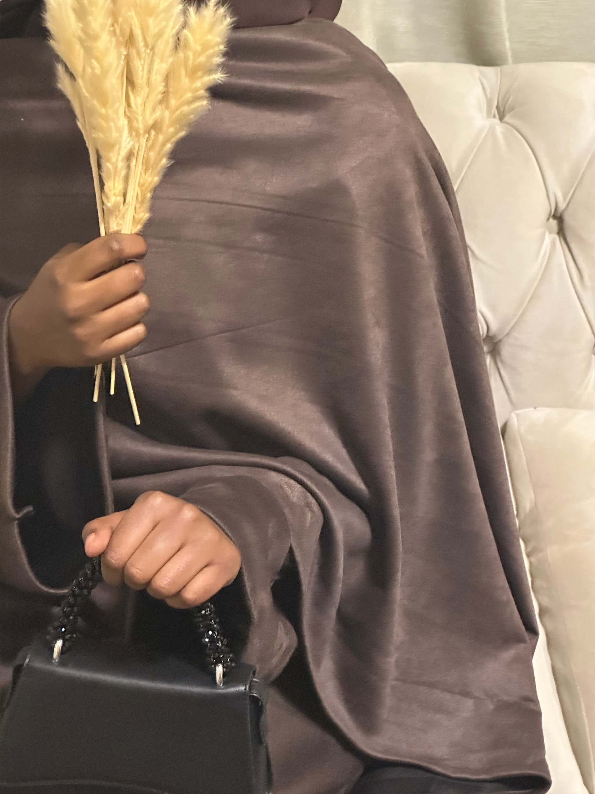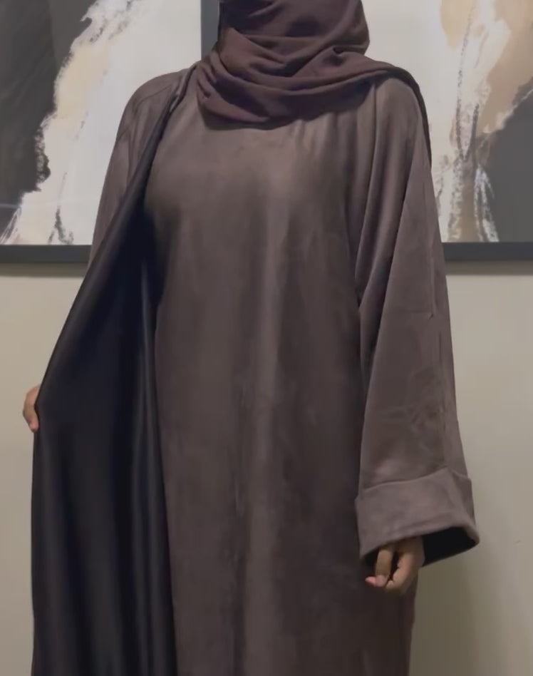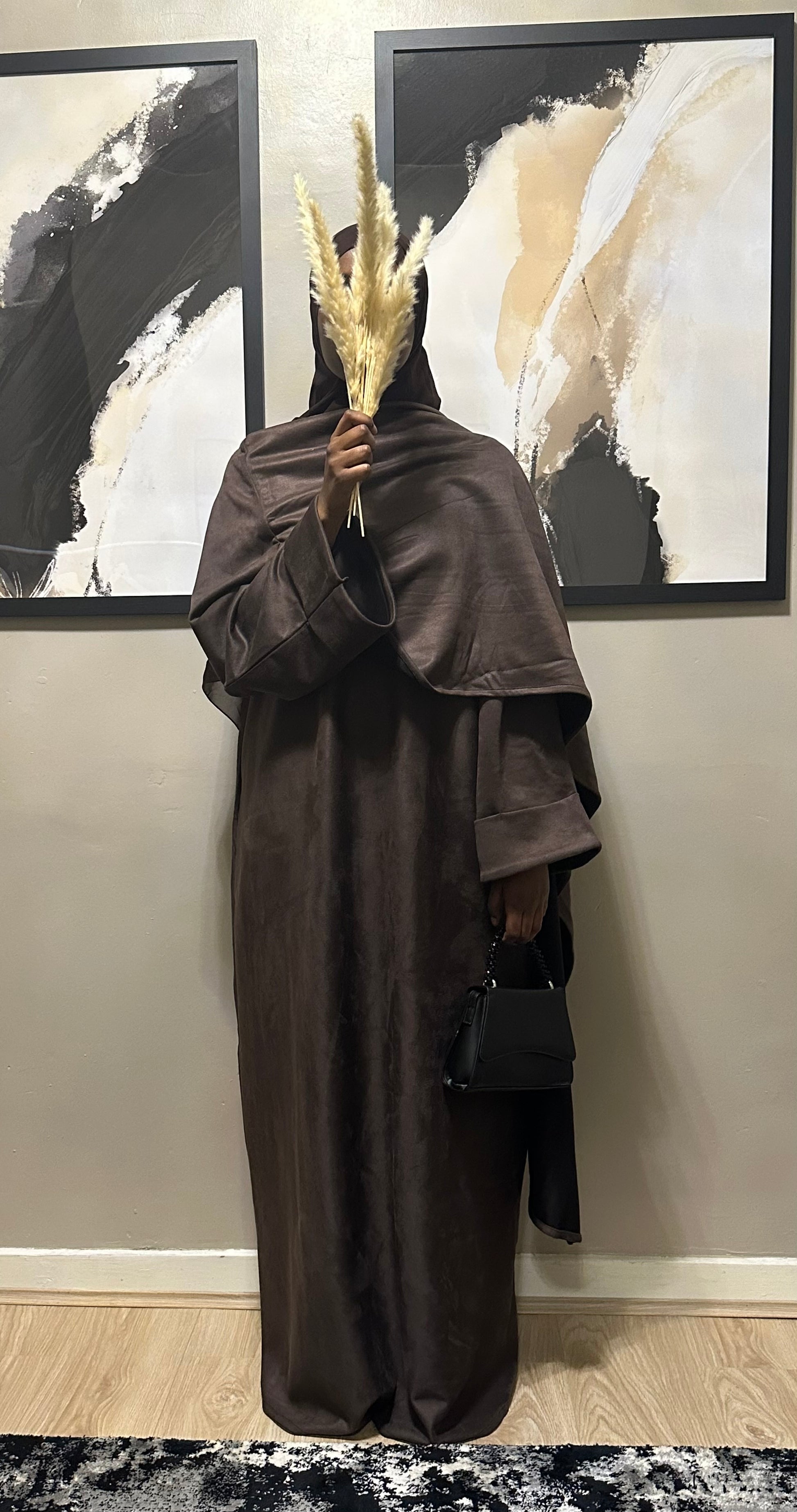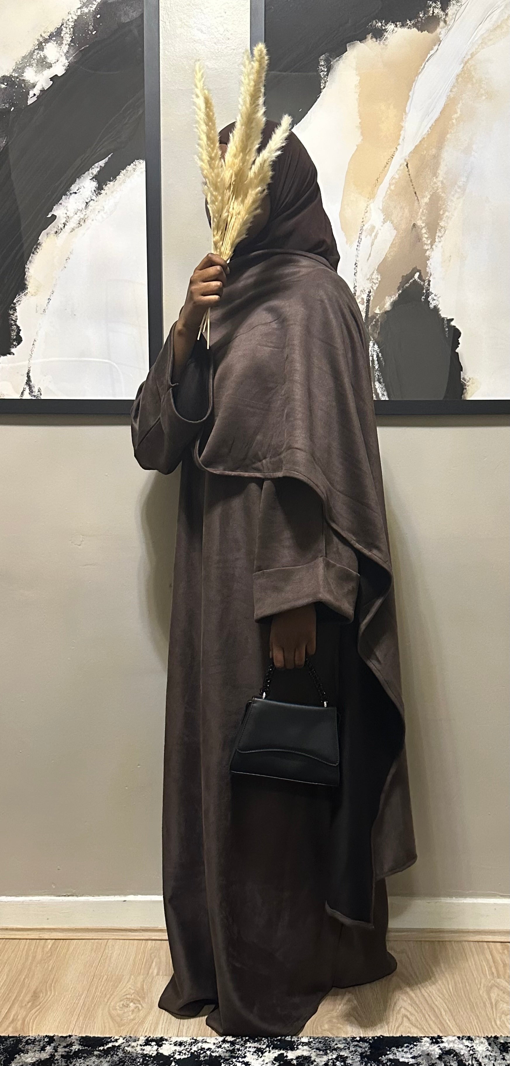 Introducing our stunning coffee suede cloak abaya, the perfect choice for autumn and winter! Crafted from luxurious suede, it promises to keep you warm and cozy during those chilly days. With two functional pockets for added practicality and a convenient button to secure your cape on your shoulder, this abaya combines style with functionality. Complete with a matching coffee chiffon hijab and belt, you can effortlessly enjoy warmth and modesty while staying chic and comfortable all season long!